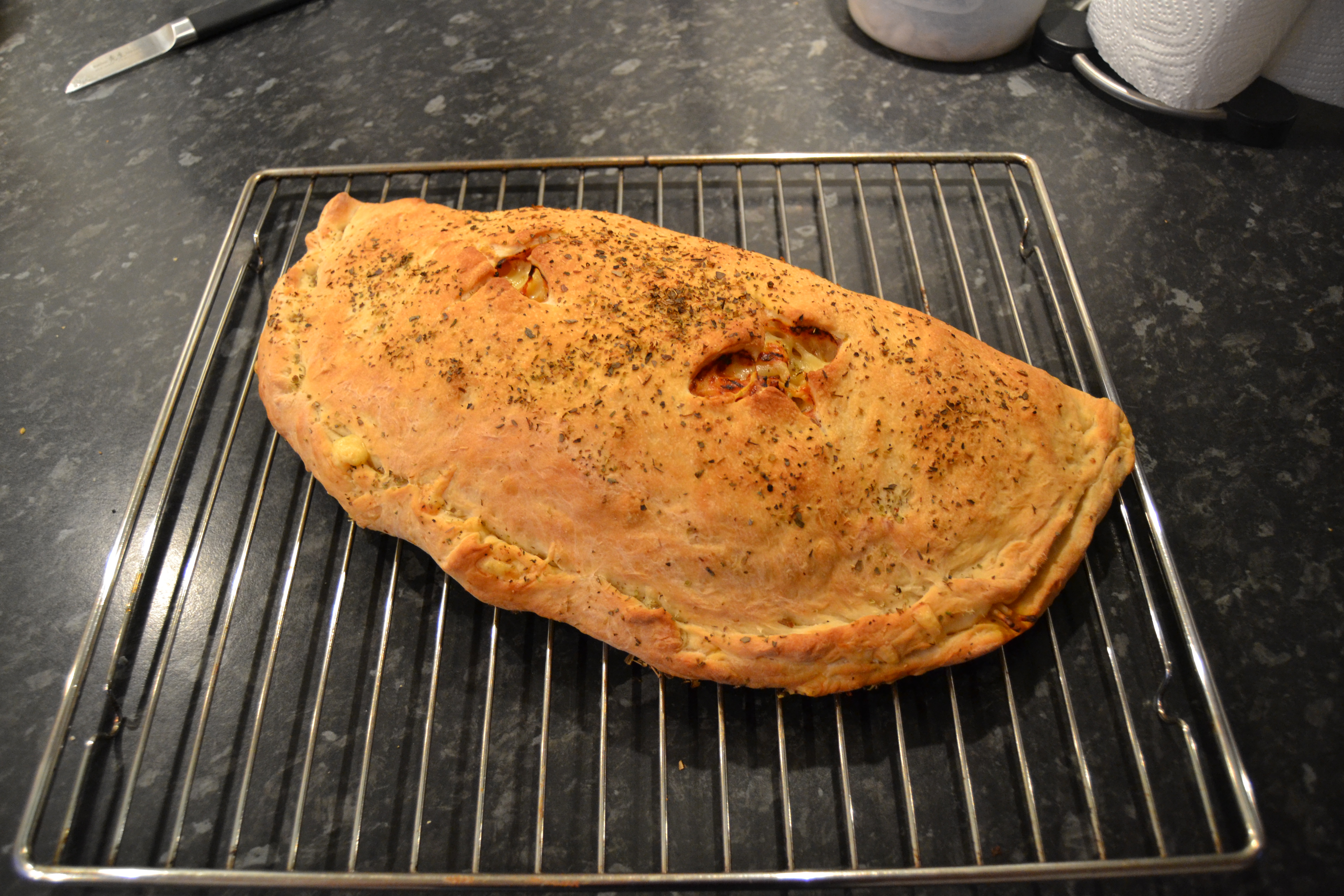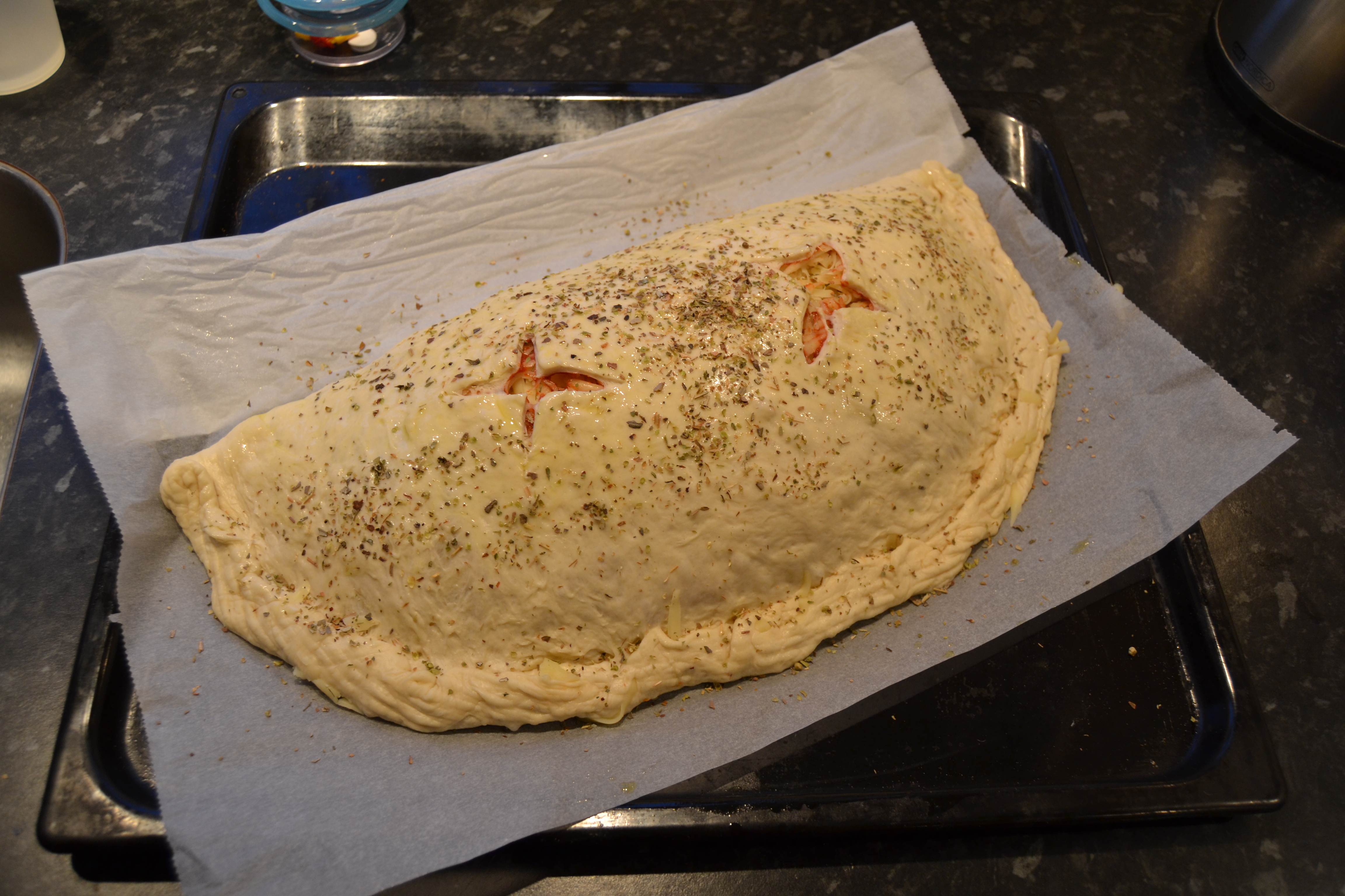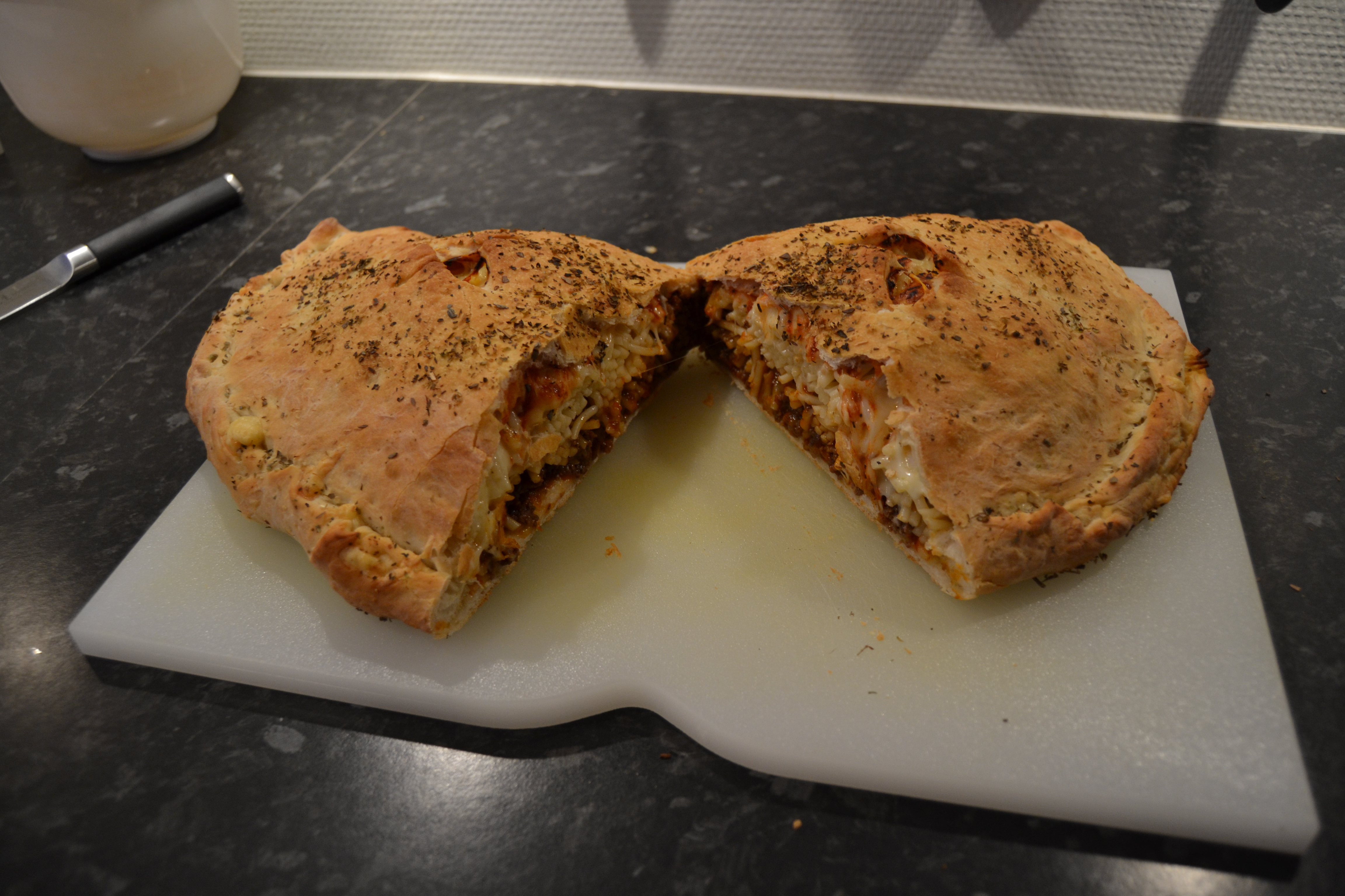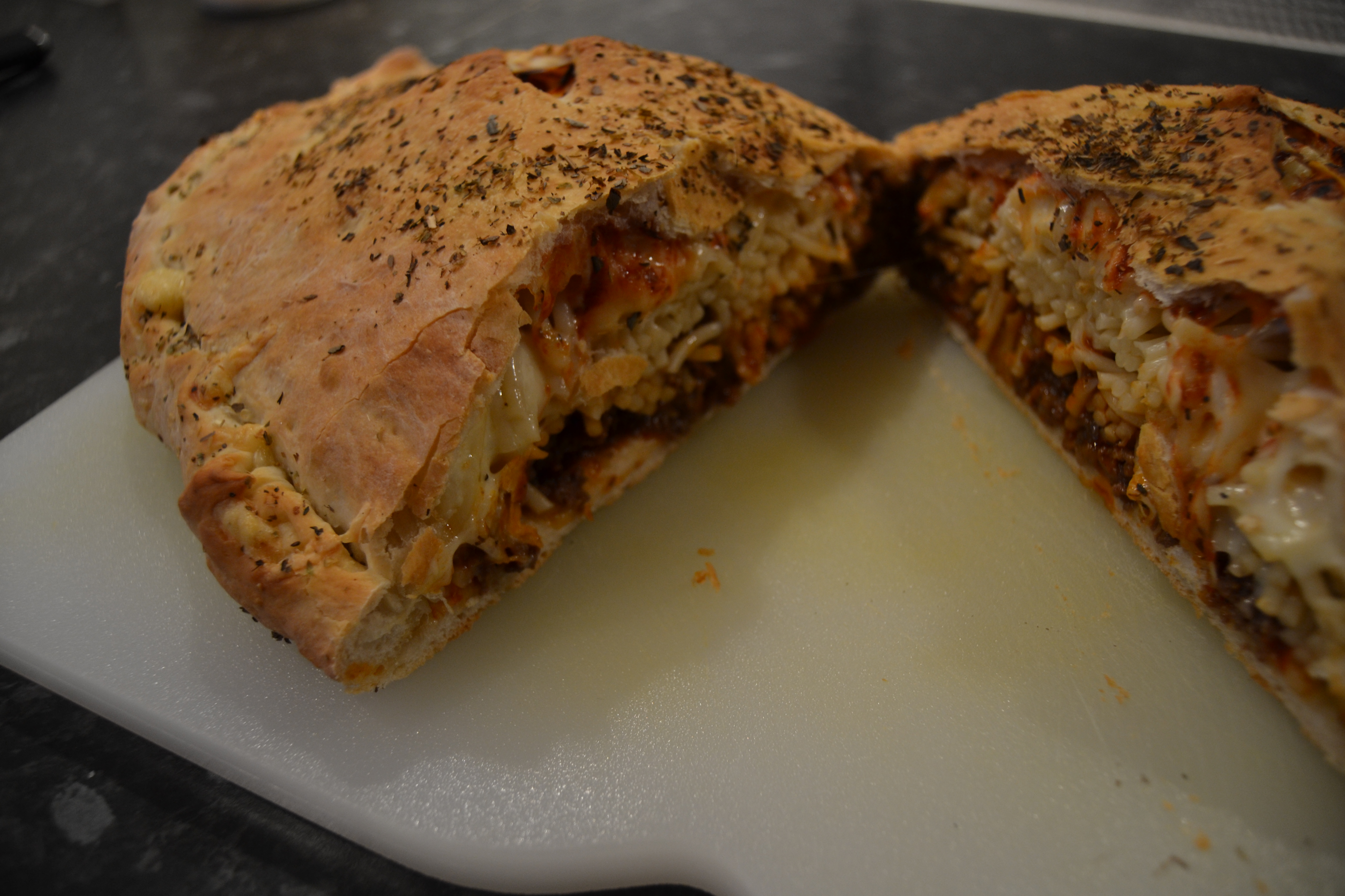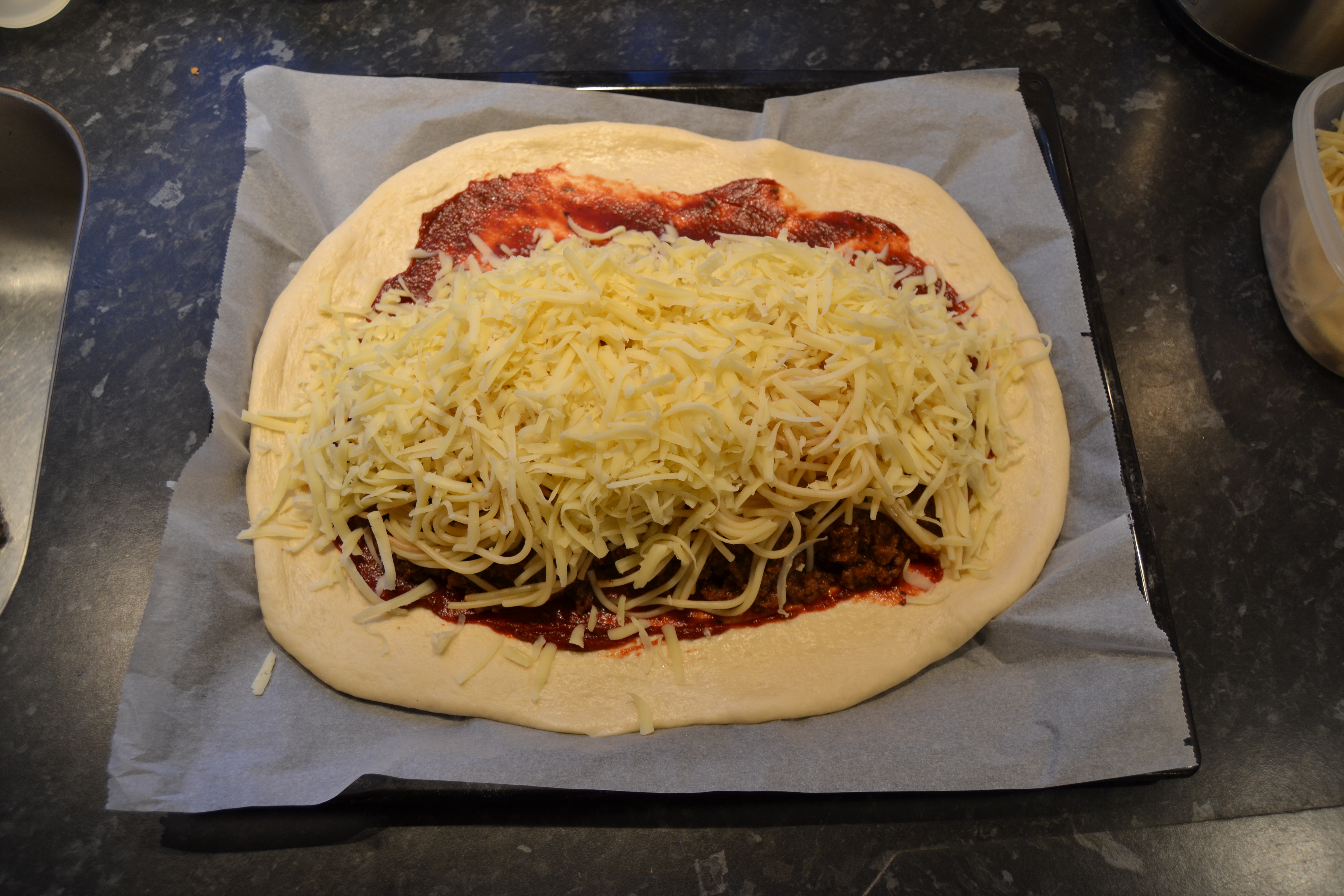 Kom tomatsovs på bunden og kom oksekødsfyld, spagetti og ost på den ene side af bunden. Fold den tomme halvdel over fyldet og rul kanten ind så pizzaen er lukket. Skær 2 kryds ovenpå pizzaen og pensel den ovenpå med olivenolie. Drys evt. lidt oregano på toppen.